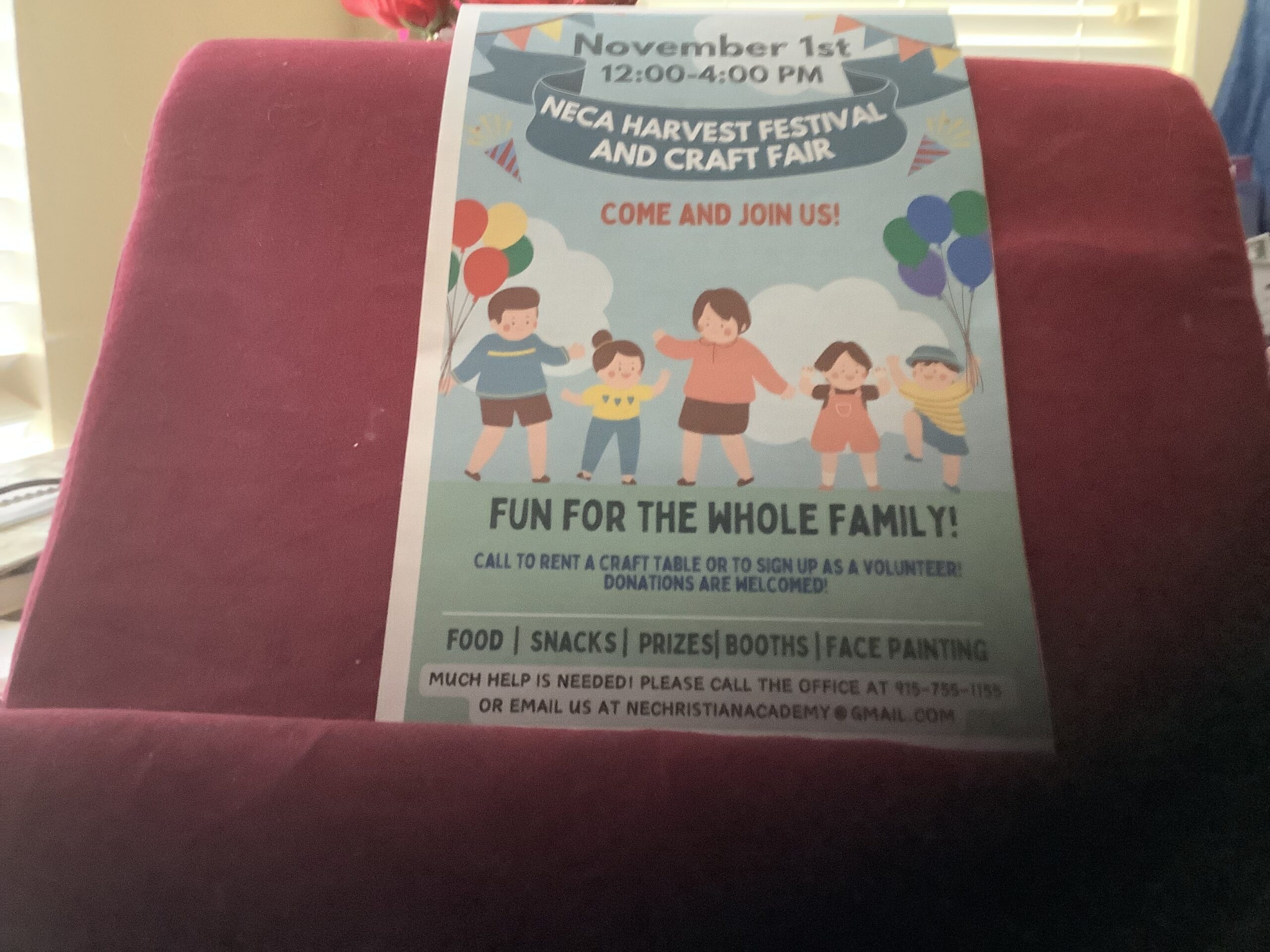 Northeast Christian academy is holding a Harvest Festival and Craft Fair on November 1 from 12 to 4 come and have fun or rent a booth. See attached flyer.