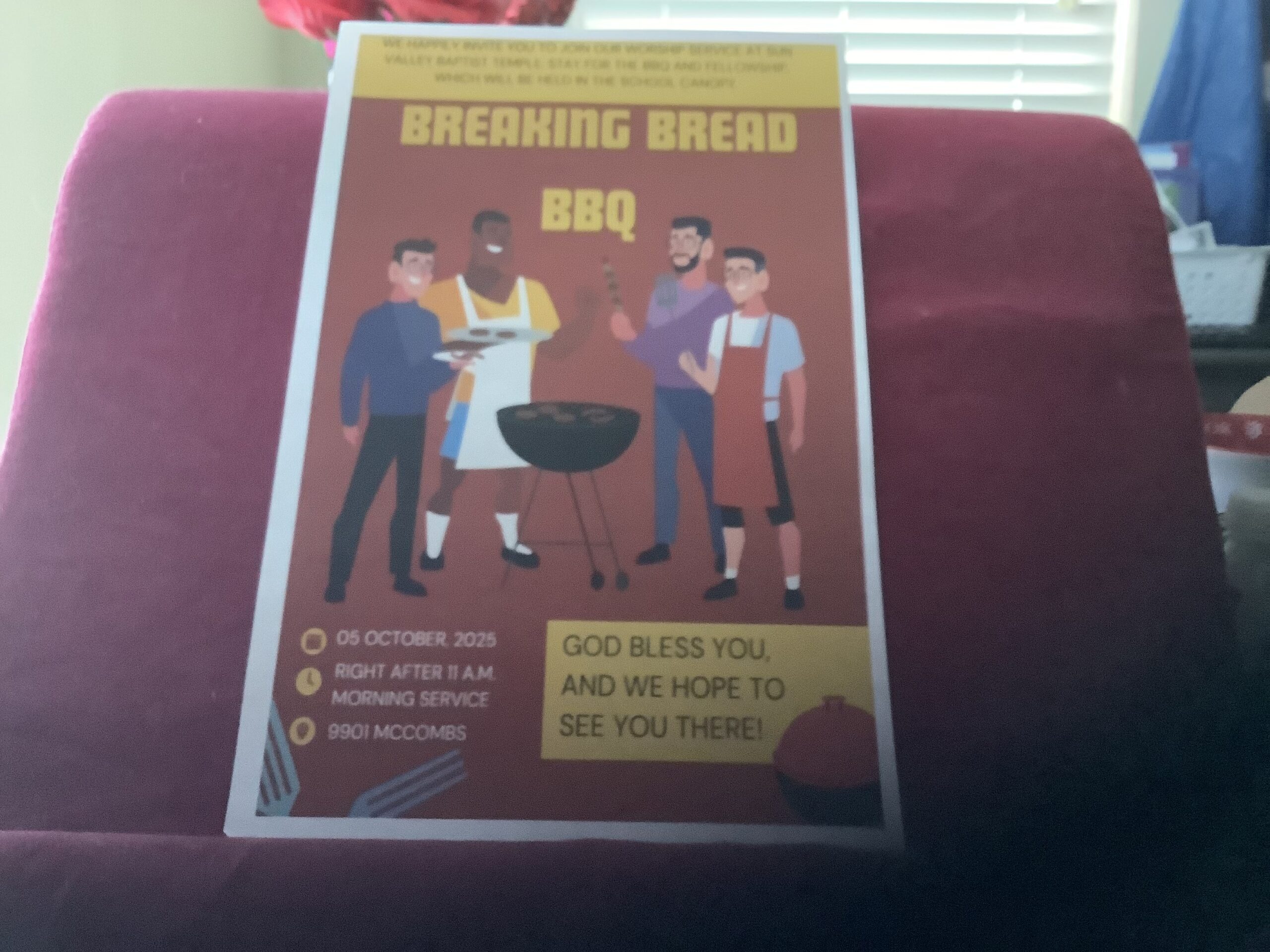 On October 5 at 11 AM after our morning Service the church is holding a Breaking Bread BBQ. Come join us and enjoy a free BBQ. See Attached Flyer for more information.